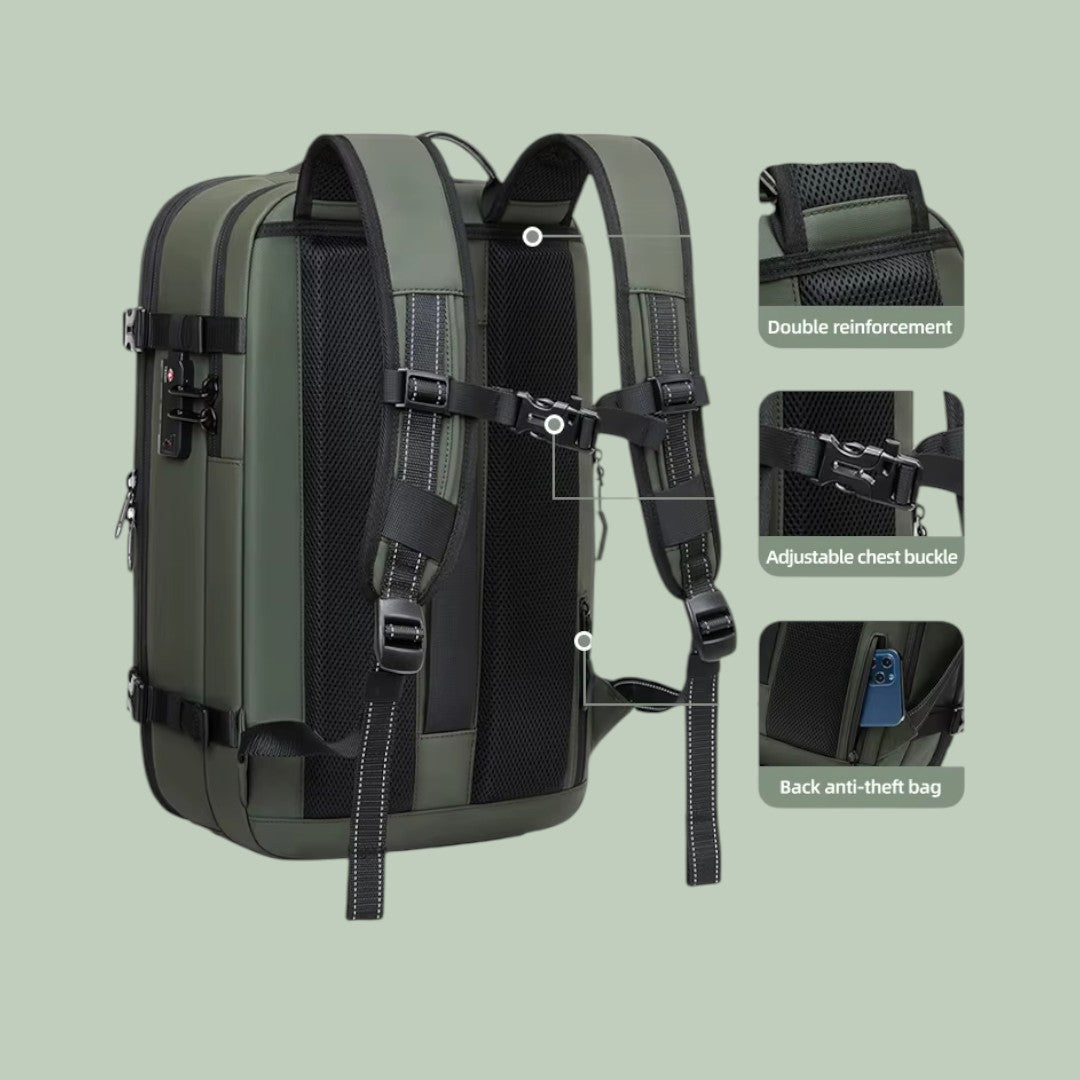 Designed with smart compartments and compression technology, the bag keeps your essentials neatly arranged, secure from shifting, and space-efficient throughout your journey.